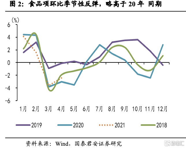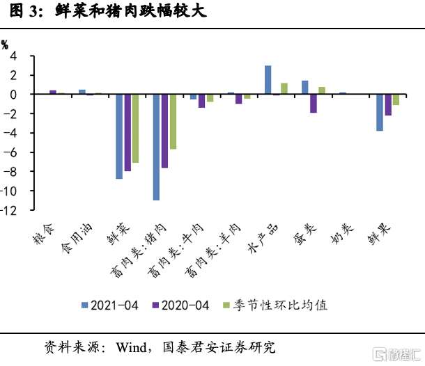 1. 受供给端影响,食品项多数弱于季节性,猪肉(-21.4%)和蔬菜(-8.8%)跌幅较大;