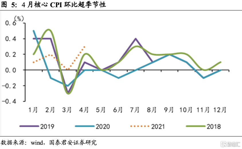 非食品项是21年CPI回升的趋势性动力,4月节日因素加速服务业恢复,叠加耐用消费品涨价,非食品项对CPI贡献超100%。非食品项继续修复,受节日因素影响,居民旅游需求大大增加,带动机票和宾馆价格普遍上涨,对应交通通信、教育文化娱乐和其他用品和服务普遍上涨,且高于季节性;大宗涨价开始向耐用消费品传导,电冰箱、洗衣机、电视机、笔记本电脑和自行车等工业消费品价格均有上涨,CPI家用器具创历史新高;整体看非食品项影响CPI上涨约1.05个百分点,而CPI上涨0.9个百分点,贡献超过100%。