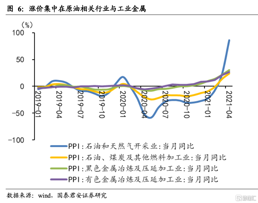 1. 大宗价格上涨和低基数是PPI超预期的主因,低基数仍将延续至5月,大宗价格上涨预期仍存,但多数大宗涨幅已经趋缓,代表性商品为原油和有色金属;