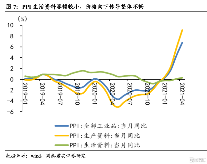 2. 生产资料向生活资料传导仍不顺畅,生活资料涨幅较小,但涨价初现端倪,耐用消费品(家电、电脑和自行车等)环比创历史新高;