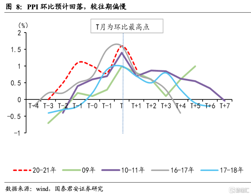 3. 对PPI后续走势,市场分歧在加大,特别是三季度PPI走势,这也是通胀预期上行的重要原因之一。目前来看,三季度PPI回落幅度相对缓和,四季度初迎来全年次高点,但次高点难超前期高点。