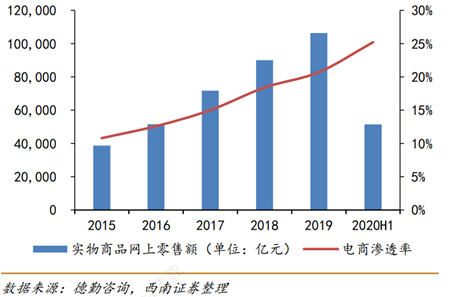 消费产品线上销售品类扩大化,快消食品类及建材家居都有较高的提升空间,疫情更是加重了电商渗透率的提升。近些年来,实物商品网上消费的品类不断扩大,其中由于商品自身特点,消费电子、服装家纺电商渗透率提升明显;快消与食品类是传统线下商超及大卖场的主力品类,即时性需求较强,建材家居类等大件商品由于其特殊的产品特性和运输难度,电商渗透率较低,有较大的提升空间。疫情催生“宅经济”,加速了线下购物向线上网购的转化,电商渗透率不断提高, 到2020年末,电商渗透率已经达到了25%。
