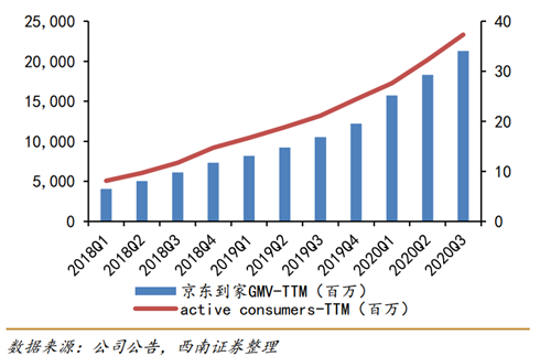 京东积极参与本地生活领域布局,扩展零售网络,将用户生活的更多领域纳入公司业务布局,提升用户粘性。根据艾瑞咨询报告, 2019 年本地即时零售市场(超市部分) GMV 已经达到 467 亿元, O2O 渗透率达1.4%,未来将以 69%的年复合增速高速增长,京东到家已成为最大的本地超市即时零售平台, 2020Q3(TTM)GMV 已达 213.0亿元,活跃用户达 3730 万。随着即时配送服务向高效、便捷发展,本地即时零售市场规模将不断扩大,京东将更广泛地渗透用户日常生活。