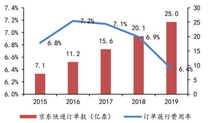 与菜鸟相比,2017年京东开放物流社会化运营,京东物流收入增长明显。随着订单密度增加,摊薄订单履约费用,京东的订单履约费用率已降至6.4%,领先于苏宁。2019Q2,京东财报电话会议透露,京东物流已实现盈亏平衡。 2019Q3, 京东物流不断扩张,第三方服务外部收入占其总收入的 40%。京东物流为实现盈利,实行开源节流的方式。京东进一步开放了个人快递业务,扩大物流订单来源,并取消底薪和下调公积金,以及增加收件任务,降低了京东物流的人力成本。
