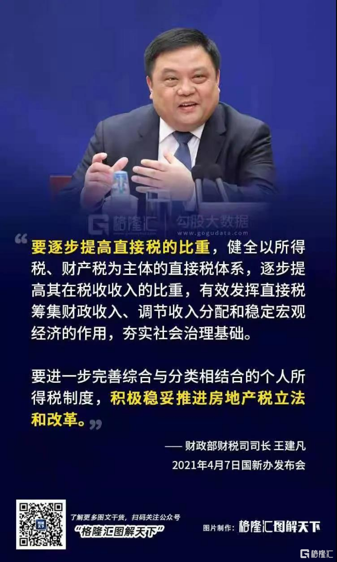 4月7日,在国务院新闻办举行的贯彻落实“十四五”规划纲要、加快建立现代财税体制发布会上,财政部税政司司长王建凡表示,要进一步完善综合与分类相结合的个人所得税制度,积极稳妥推进房地产税立法和改革。