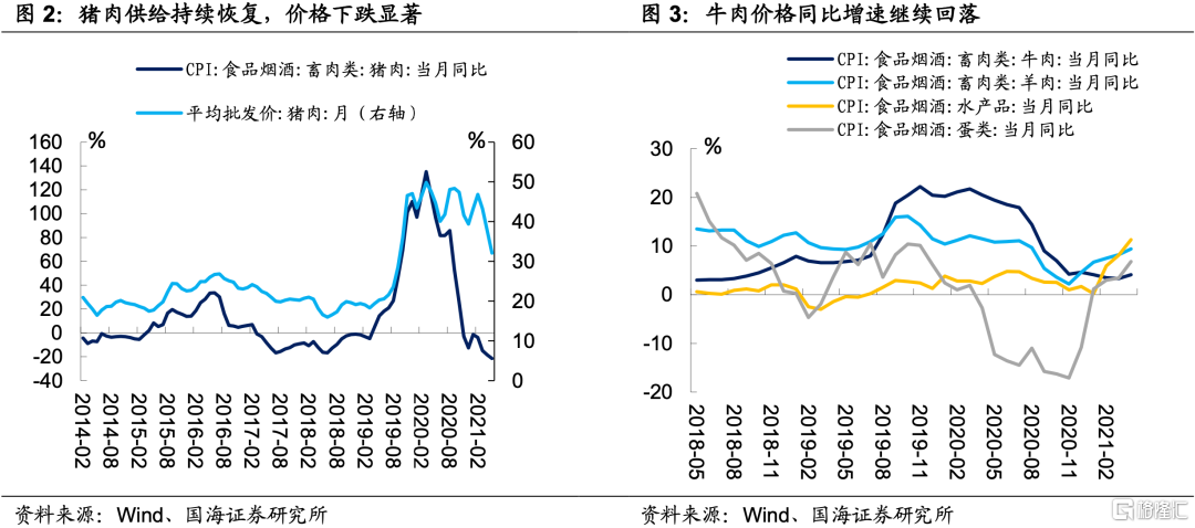 4月CPI食品项同比回落0.70%,增速与上月持平。4月份,猪肉价格的继续下跌,同比下降21.40%,跌幅较上月扩大3个百分点。一方面,猪肉生产持续恢复背景下,猪肉价格受明显抑制。另一方面,春节过后,猪肉消费需求逐渐回落,猪肉价格继续下滑。