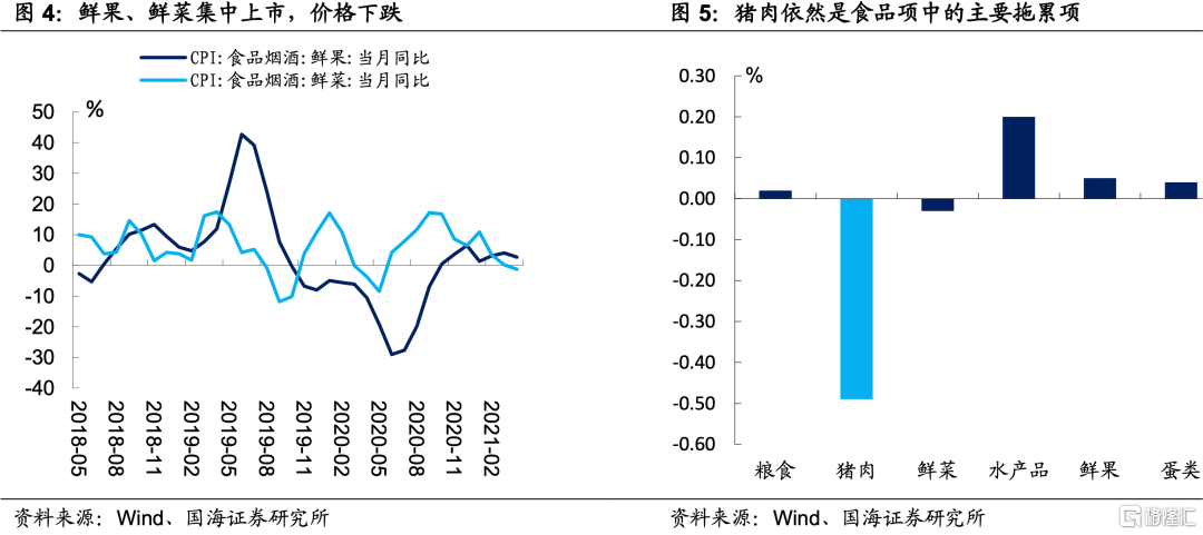 整体来看,猪肉价格的下跌依旧是食品项拖累整体CPI的主要原因。4月份,所有食品大项中对CPI同比增速产生正贡献的有粮食、水产品、鲜果以及蛋类,分别拉动CPI同比增加0.02、0.20、0.05、0.04个百分点;对CPI同比增速产生负贡献的有猪肉和鲜菜,分别拉动CPI同比降低0.49以及0.03个百分点。