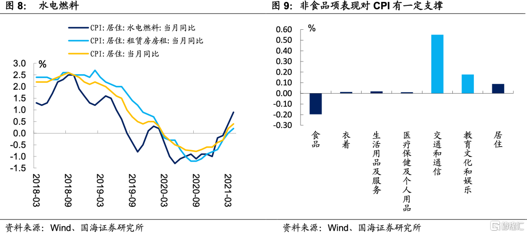 整体来看,4月份非食品项表现明显优于CPI食品项,其中交通通信及教育文化和娱乐对CPI同比增速拉动最大,分别拉动CPI同比增加0.55、0.18个百分点。考虑到今年五一长假出游火爆,叠加去年5月份疫情未完全可控,各项数据基数较低,预计5月份的价格数据中,以交运燃料、旅游为代表的价格项依旧能得到支撑。