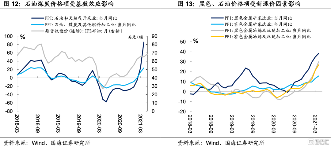PPI方面,原材料及开采相关产业PPI继续保持了较高增速。其中,石油相关项价格增速主要受去年同期低基数影响,而黑色及有色金属价格则与4月份新的涨价因素相关。
