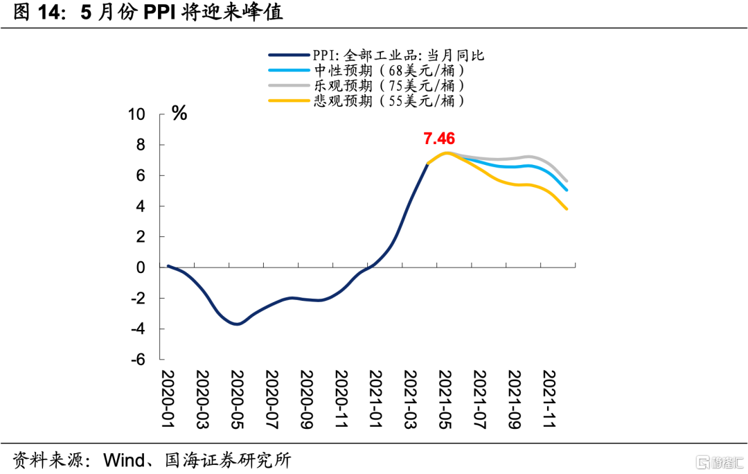 市场先前对本月PPI同比增速登上6%有一定准备,但实际值仍超越市场一致预期,这可能与4月份以来国际大宗商品价格再次上涨有一定关系。5月份是去年多项价格数据的低点,叠加近期国际大宗商品出现新的涨价因素,我们预计5月份PPI同比增速或将达到7.46%。