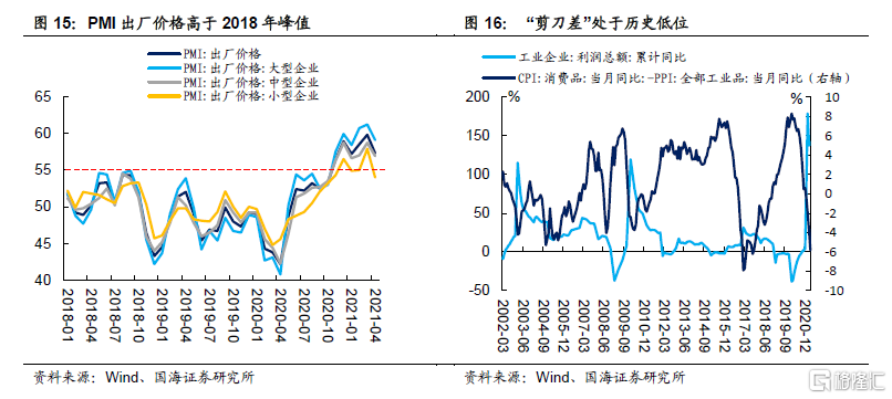 预计5月份PPI同比增速或将达到7.46%。与此同时,目前价格传导存在不畅,“剪刀差”现象加剧,工业企业利润或面临下行风险。
