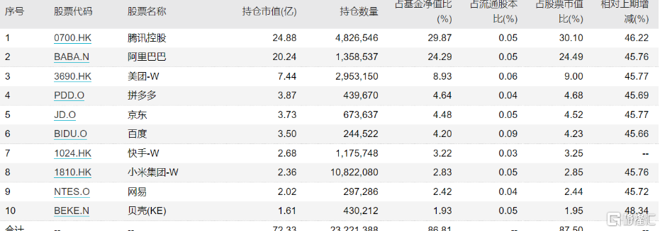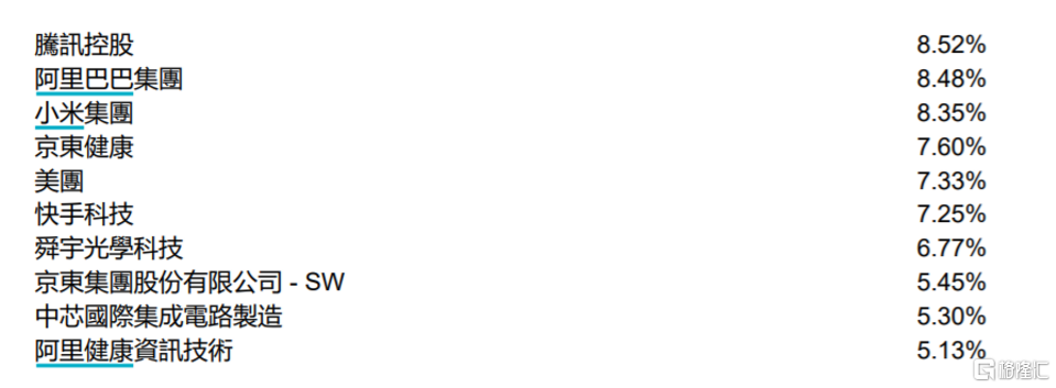 从持仓来看,港股主要的互联科技均在里面,重仓股当中,腾讯、阿里巴巴、小米的资金占比在8%以上,京东健康、美团、快手科技资金占比在7%以上;