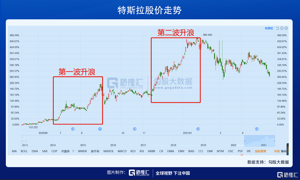 从日K线图看,去年新冠肺炎爆发之后,特斯拉有两段较为明显的升浪,一段是7月至8月,之后跟随大市回调。两个月后,即11月起,开始第二波升浪,并一路延续到21年1月末,并创出900美元(前复权)的历史性高位。
