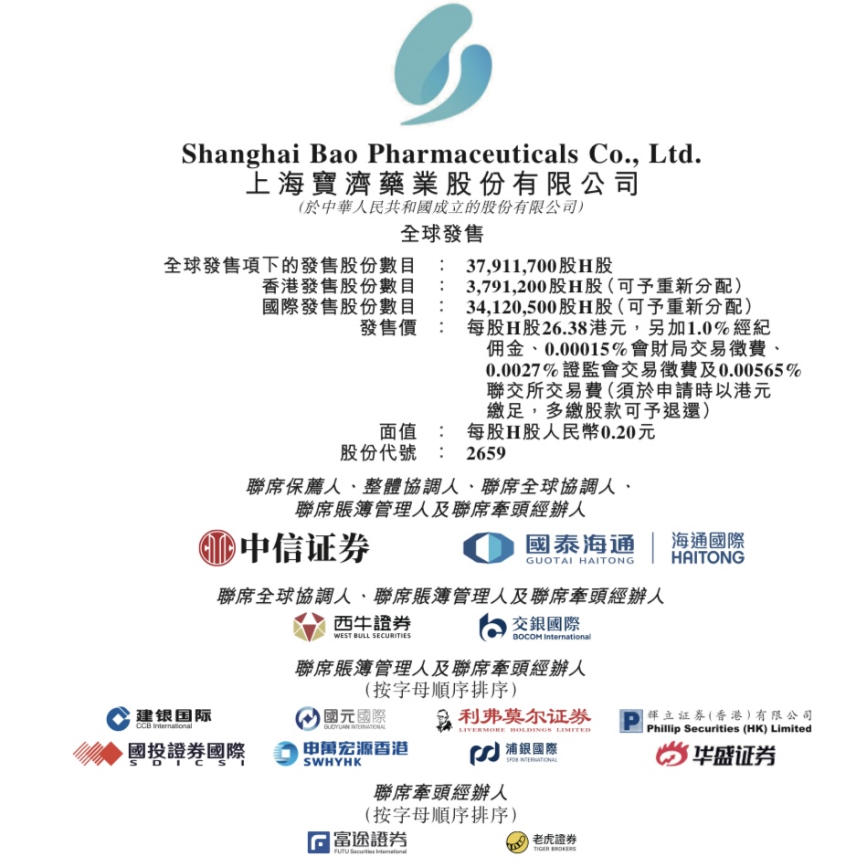 上海宝济药业股份有限公司(Shanghai Bao Pharmaceuticals Co., Ltd., 2659.HK)启动香港IPO,招股期为12月2日至12月5日,拟全球发售约37,911,700股H股;每股发售价为26.38港元,每手100股,入场费约2,664.60港元;预期12月10日于联交所主板挂牌,中信证券、国泰海通及海通国际为联席保荐人。