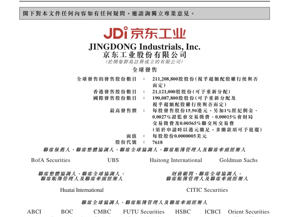 京东工业股份有限公司(JINGDONG Industrials, Inc., 7618.HK)启动香港IPO,招股期为12月3日至12月8日,拟全球发售211,208,800股,并设15%超额配股权;每股发售价介乎12.70—15.50港元,每手200股,入场费约3,131.26港元;预期12月11日于联交所主板挂牌,联席保荐人为美银证券、瑞银集团、海通国际及高盛(亚洲)。