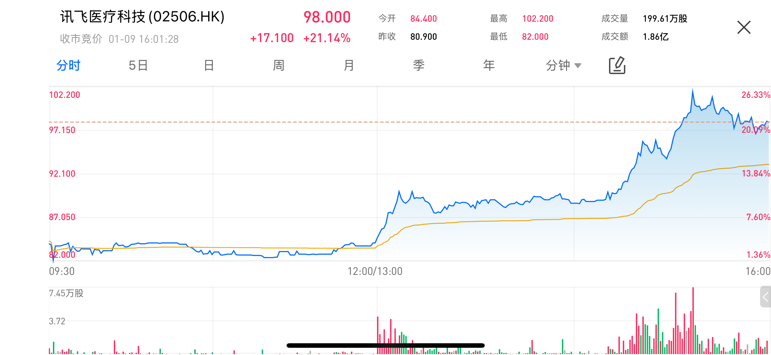 2026年1月9日,讯飞医疗科技(02506.HK)股价在香港股市迎来强势反弹。该公司今天收盘报98.00港元,较开盘价84.40港元上涨了21.14%。随着公司在人工智能医疗领域的技术不断创新,股价涨幅一度突破20%。从分时走势来看,股价上午整体维持窄幅震荡,午后涨势逐步加快,股价中枢明显抬升,反映出市场对相关标的关注度持续升温。