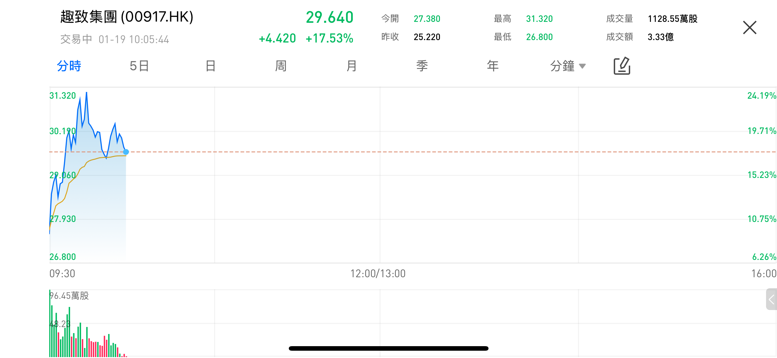 2026年1月19日,港股趣致集团(00917.HK)早盘股价大幅走高,盘中一度触及31.32港元,最新报29.64港元,涨幅达17.53%,成交额明显放大,成为市场关注度较高的个股之一。