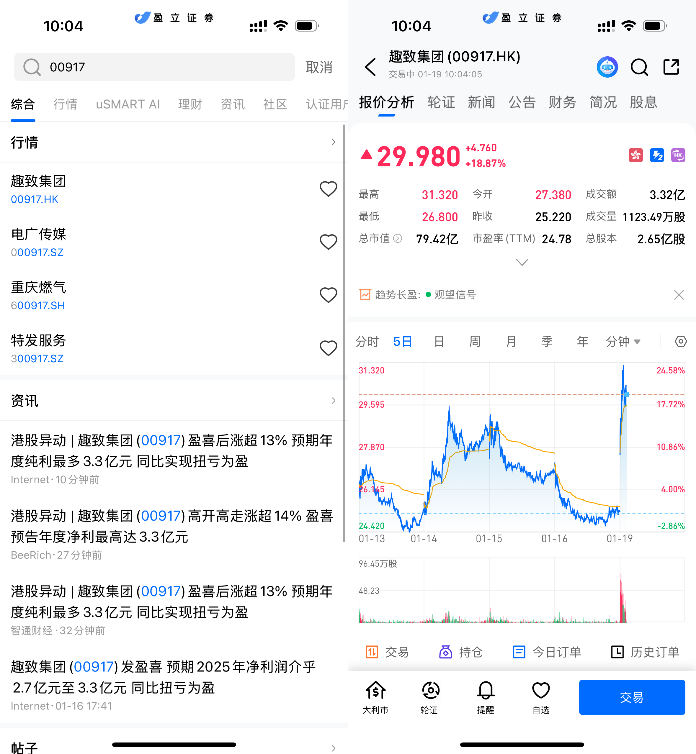 登入 uSMART HK APP 后,于页面最右上方点击「搜索」,输入标的代码(00917.HK)并进入详情页,了解交易详情与历史走势。点击右下角「交易」,选择交易类型,最后填写交易条件后送出订单即可。