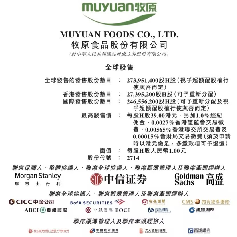 牧原食品股份有限公司(MUYUAN FOODS CO., LTD., 02714.HK)启动香港IPO,招股期为2026年1月29日至2月3日,拟全球发售273,951,400股H股,并设15%超额配股权;每股最高发售价39.00港元,每手100股,入场费约3,939.34港元;预期2026年2月6日于联交所主板挂牌,摩根士丹利、中信证券及高盛为联席保荐人。