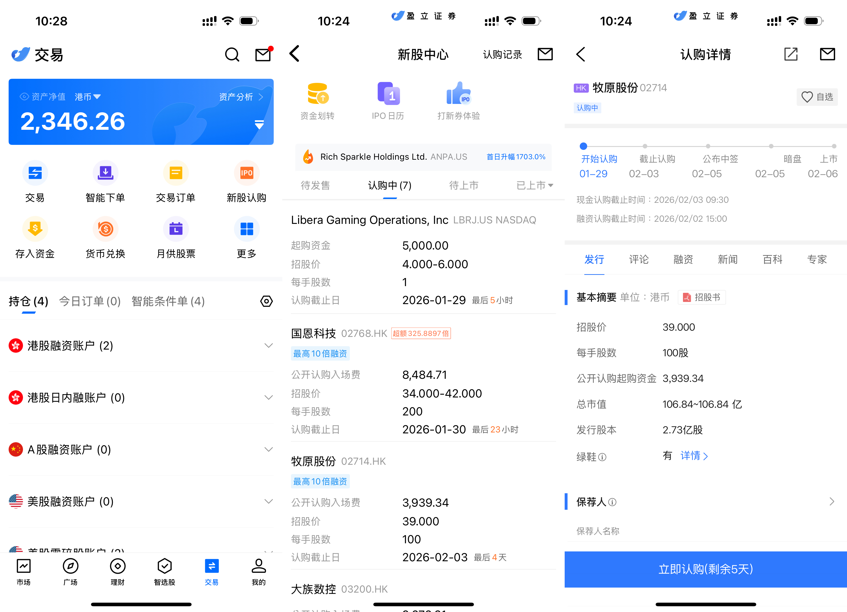 uSMART HK App 设有 IPO 中心,提供独家优惠,客户可在 App 即时认购公开发售之新股。登入 uSMART HK App 后,点选右下角「交易」,进入「新股认购」,选择牧原股份后点击「公开认购」,填写认购数量并提交订单即可。