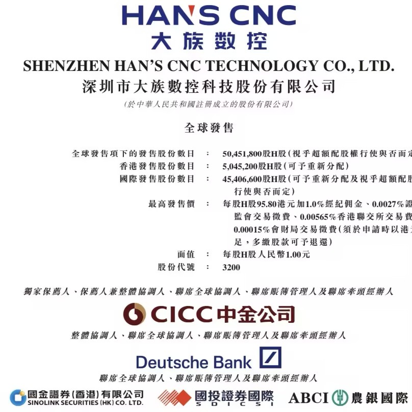 深圳市大族数控科技股份有限公司(SHENZHEN HAN'S CNC TECHNOLOGY CO., LTD., 03200.HK)启动香港IPO,招股期为2026年1月29日至2026年2月3日,拟全球发售50,451,800股H股,并设15%超额配股权;最高发售价为每股95.80港元,每手100股,入场费约9,676.14港元;预期2026年2月6日于联交所主板挂牌,中金公司为独家保荐人。