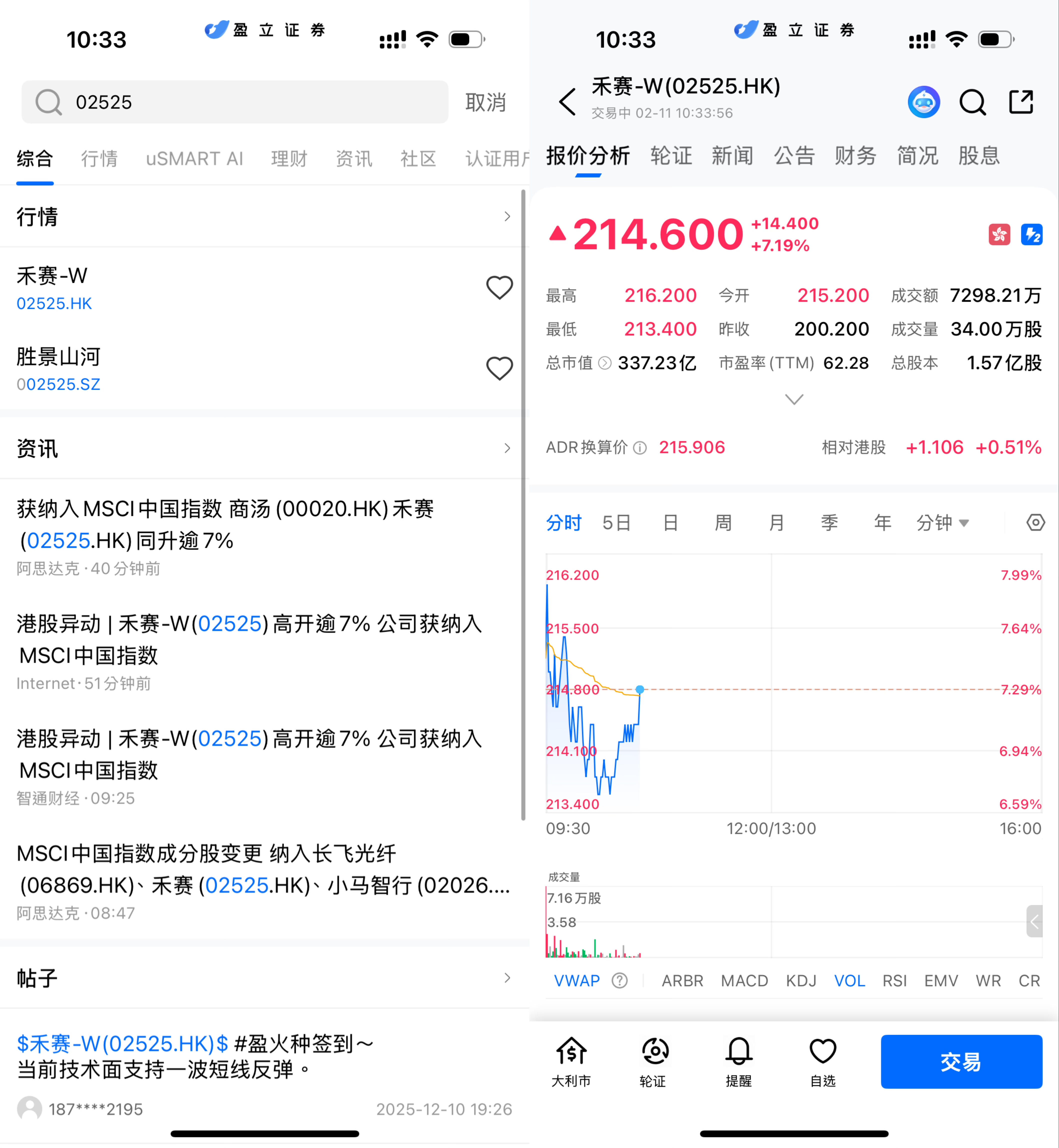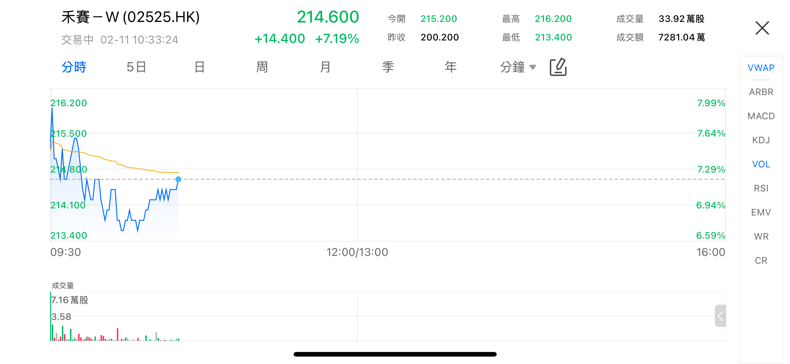 港股早盘,禾赛科技-W(02525.HK)显著走强。截至 2 月 11 日上午交易时段,股价报 214.6 港元,较昨日收市价 200.2 港元上涨 7.19%,盘中一度冲高至 216.2 港元,成交额约 7,281 万港元。