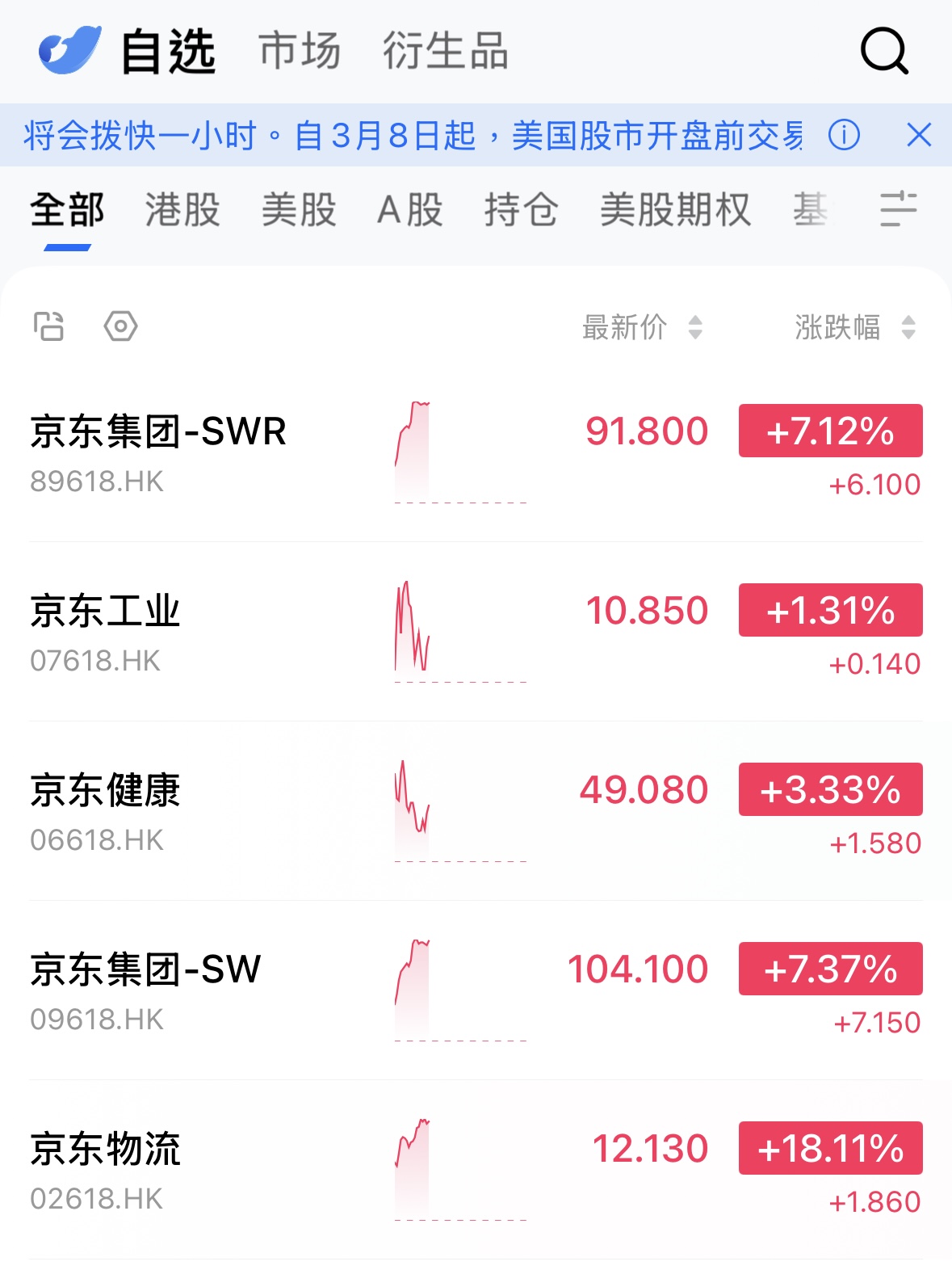 港股早盘,受京东集团最新财报提振,“京东系”个股集体走高。截止发稿,$京东集团-SW (09618.HK)$ 涨7.37%,$京东集团-SWR (89618.HK)$ 涨7.12%,$京东健康 (06618.HK)$ 上涨3.33%,$京东工业 (07618.HK)$ 微涨1.31%,$京东物流 (02618.HK)$ 更是一度大涨18.11%。