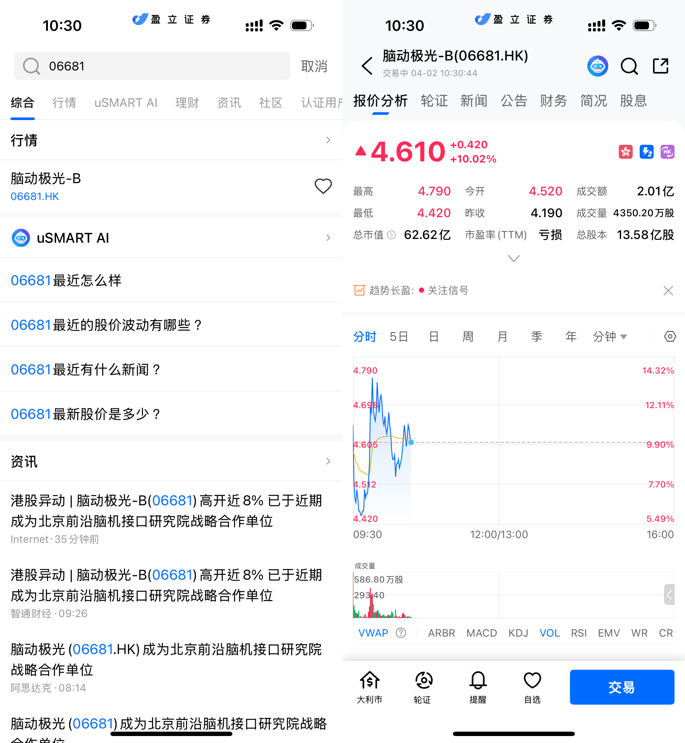 登入 uSMART HK APP 后,于页面最右上方点击「搜索」,输入标的代码(06681.HK)并进入详情页,了解交易详情与历史走势。点击右下角「交易」,选择交易类型,最后填写交易条件后送出订单即可。
