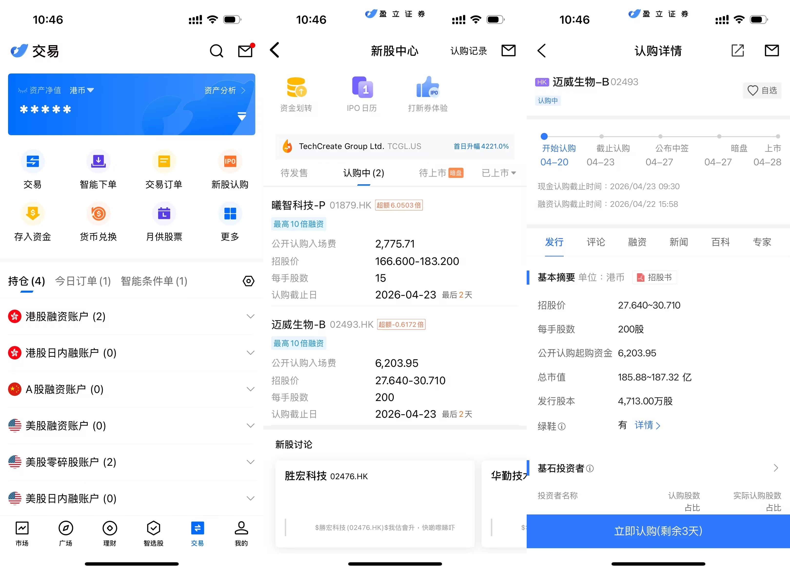 uSMART HK App 设有 IPO 中心,提供独家优惠,客户可在 App 即时认购公开发售之新股。登入 uSMART HK App 后,点选右下角「交易」,进入「新股认购」,选择迈威生物后点击「公开认购」,填写认购数量并提交订单即可。