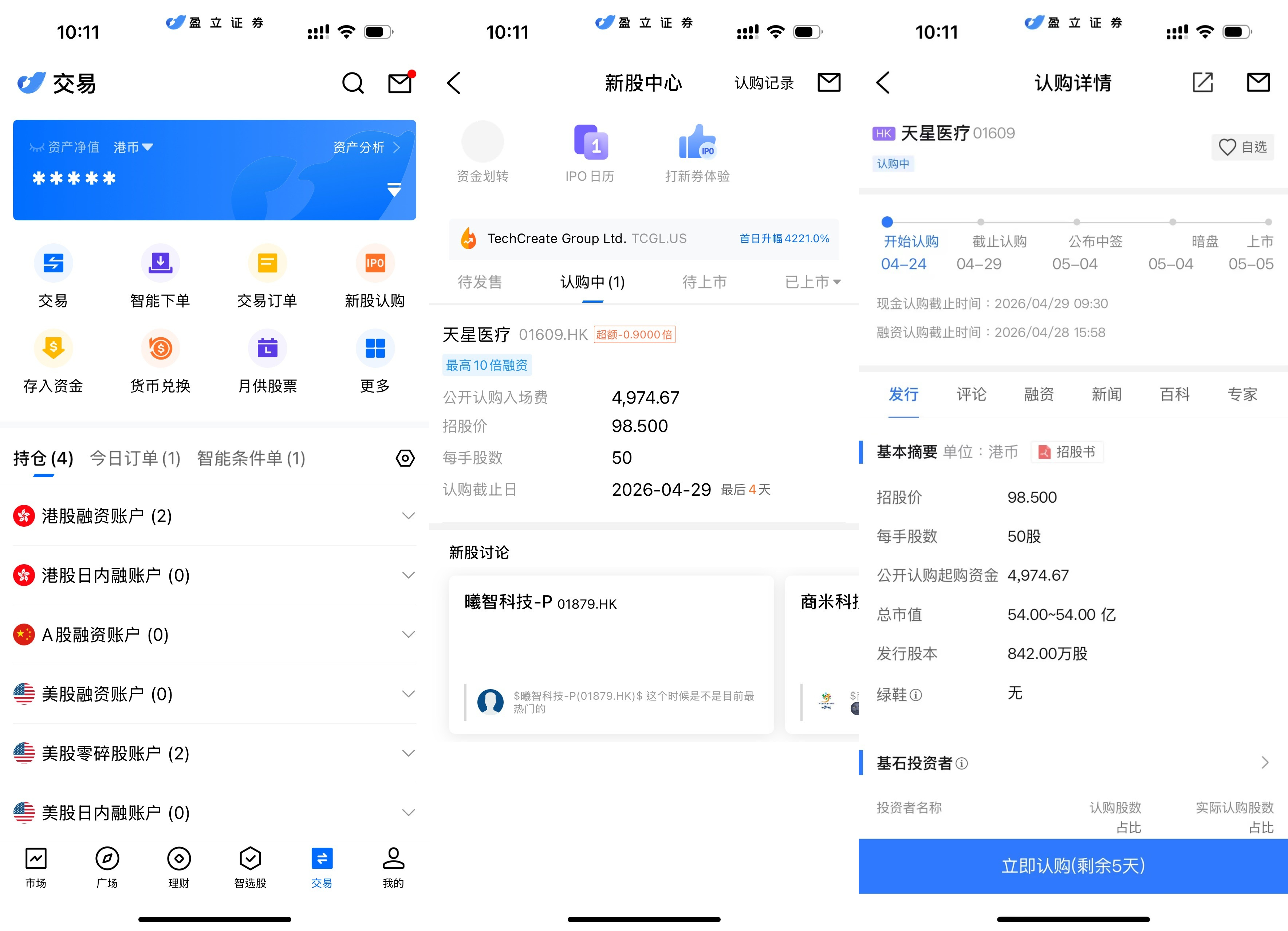 uSMART HK App 设有 IPO 中心,提供独家优惠,客户可在 App 即时认购公开发售之新股。登入 uSMART HK App 后,点选右下角「交易」,进入「新股认购」,选择天星医疗后点击「公开认购」,填写认购数量并提交订单即可。