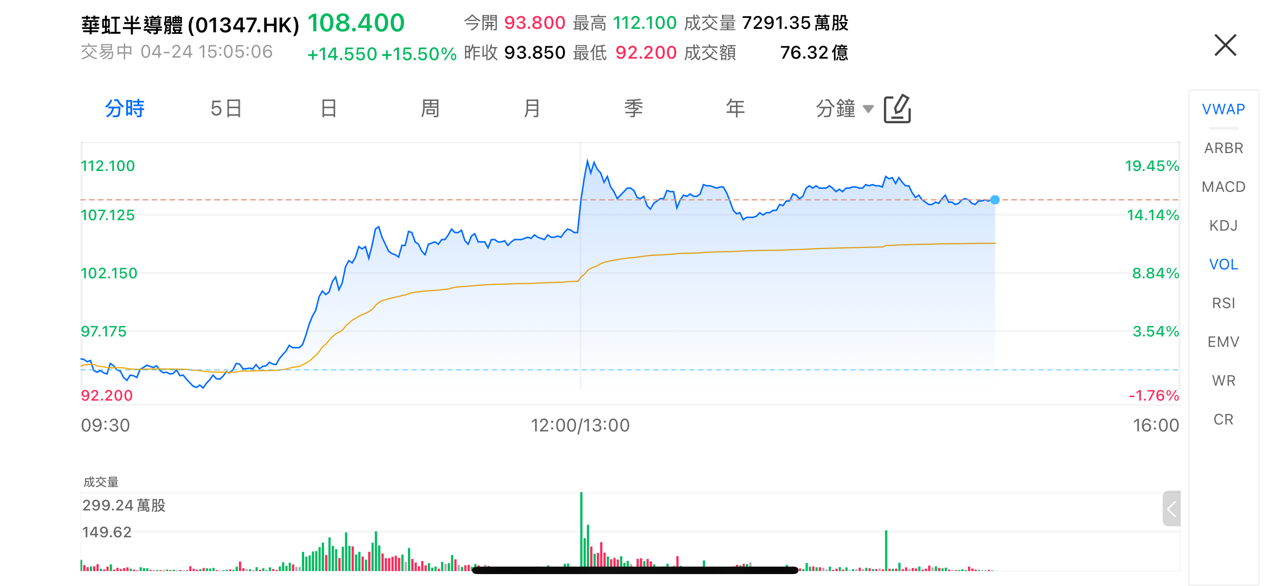 2026年4月24日,半导体产业链板块强劲反弹,华虹半导体(01347.HK)表现抢眼。截至15:05,公司股价上涨15.50%,领先于整体市场涨幅,反映出投资者对其在国产化进程中的重要地位的认可。