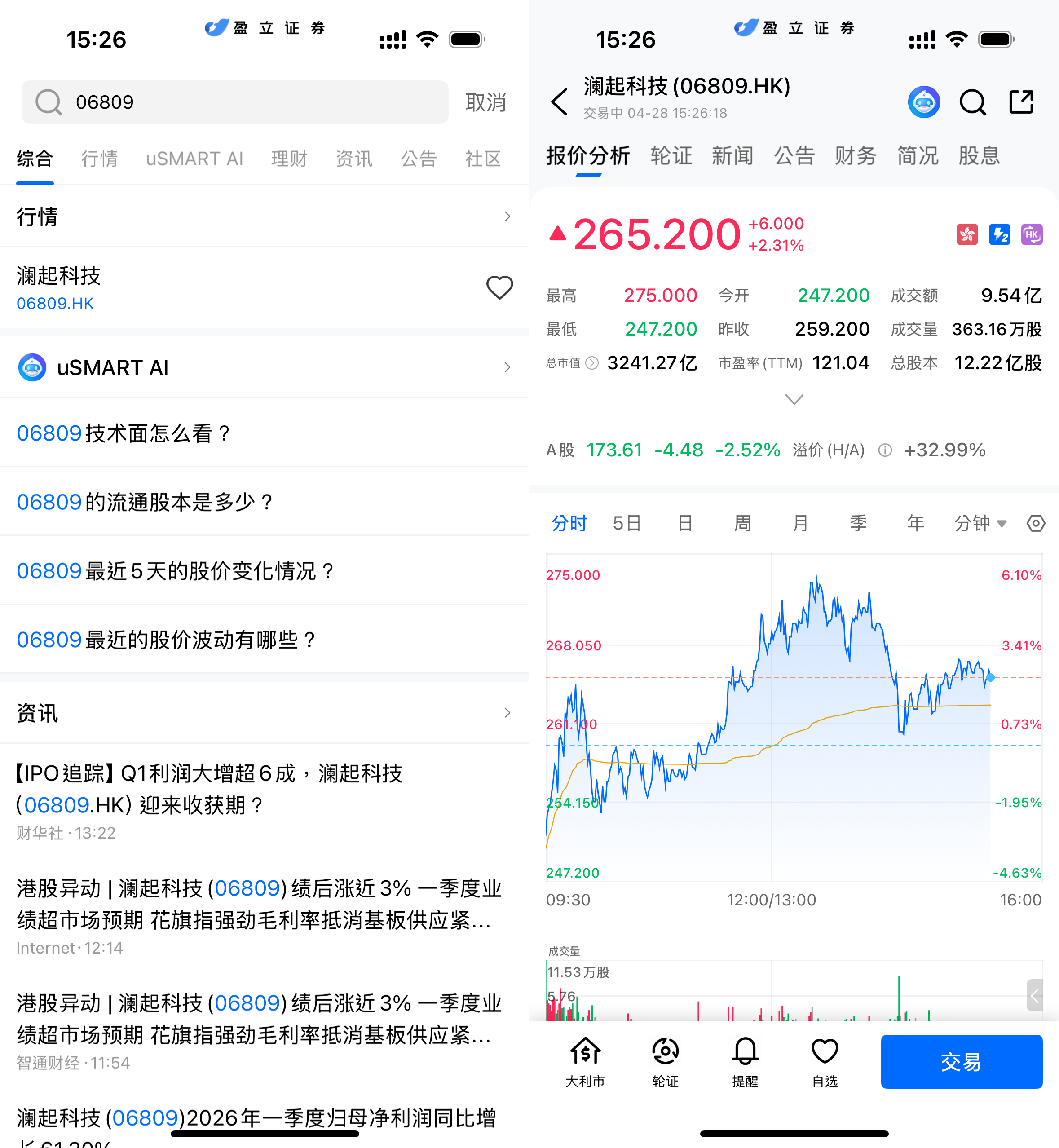 登入 uSMART HK APP 后,于页面最右上方点击「搜索」,输入标的代码(06809.HK)并进入详情页,了解交易详情与历史走势。点击右下角「交易」,选择交易类型,最后填写交易条件后送出订单即可。
