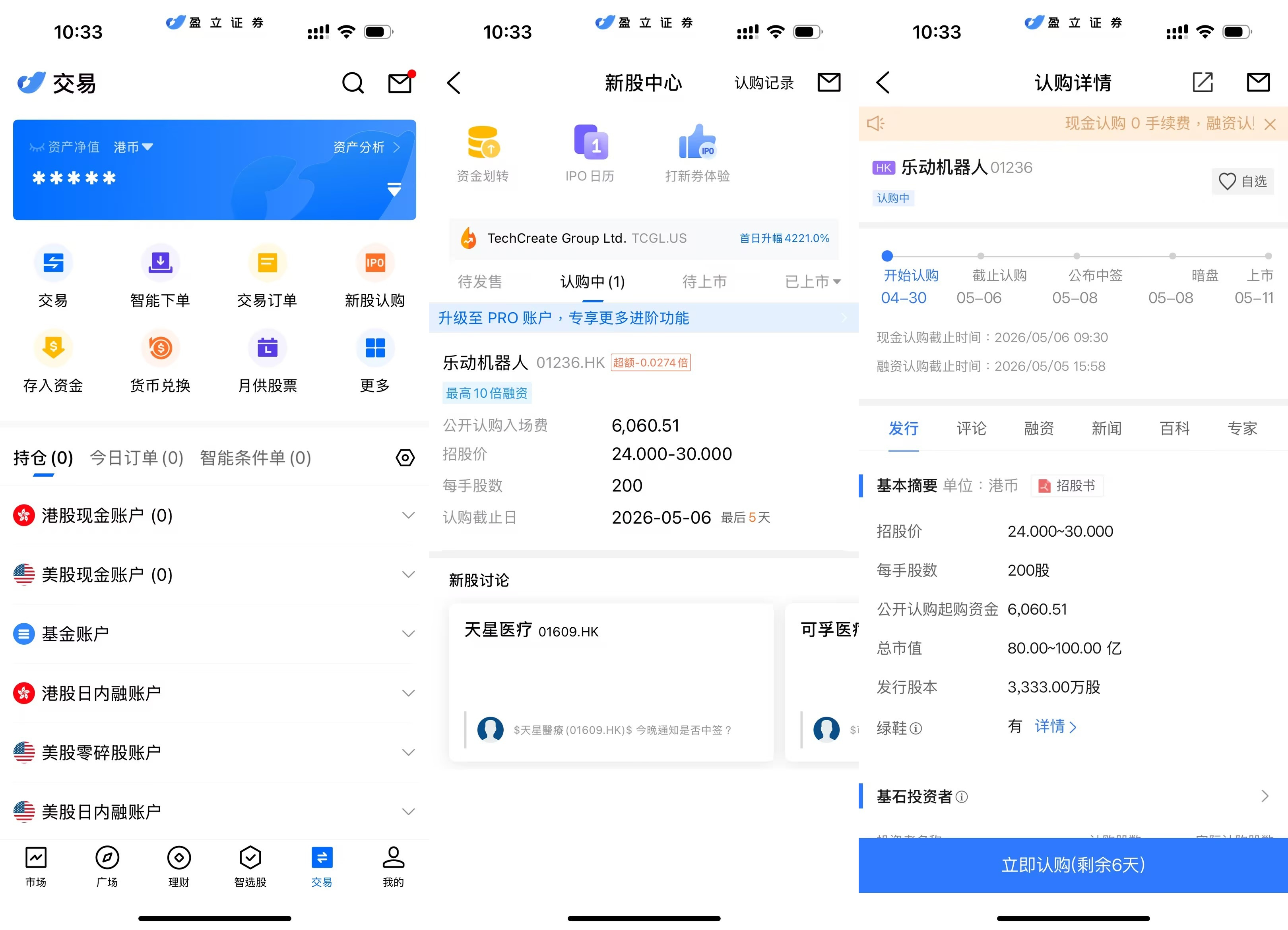 uSMART HK App 设有 IPO 中心,提供独家优惠,客户可在 App 即时认购公开发售之新股。登入 uSMART HK App 后,点选右下角「交易」,进入「新股认购」,选择乐动机器人后点击「公开认购」,填写认购数量并提交订单即可。