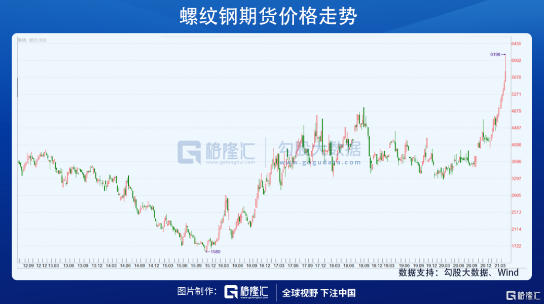 去年4月疫情在全球爆发,把各种资产价格砸出一个大坑,大宗商品也不例外。紧接着,美联储带头大放水,美元万亿接万亿地向市场投放,商品因此迎来一波旱地拔葱式的上涨,价格奔着近二十年的高点就去了,此前部分涨得猛的品种,比如铁矿石、螺纹钢等价格早已经新高了。