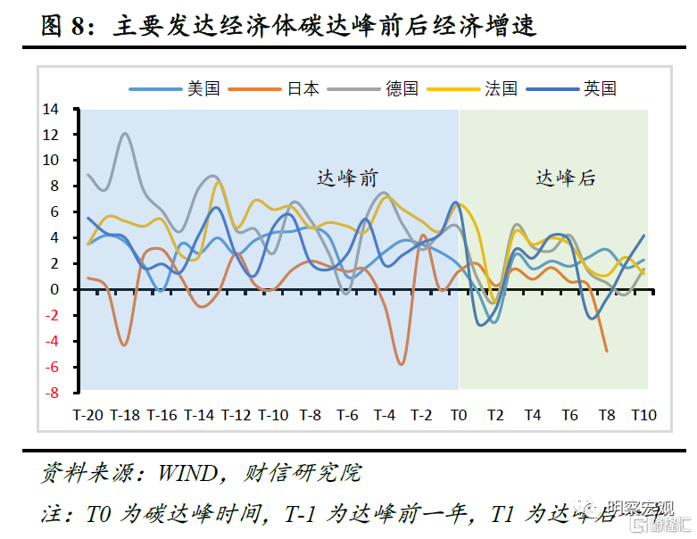 一是中高经济增速下,碳达峰目标完成难度较大。按照计算公式“碳排放量=碳排放强度*GDP”,实现碳达峰需要做到碳排放强度降低带来的减排量足以抵消经济增长带来的碳排放增量。根据国际历史经验,发达经济体实现碳达峰往往是经济增速“下台阶”和产业转型的自然结果(见图8),且在产业转型过程中将部分高碳行业转移海外,即通过“碳转移”实现碳达峰。对于我国,一方面肩负“2035年实现经济总量或人均收入翻一番”等经济发展硬指标,要求2020-2035年平均GDP增速达到4.7%以上,在保证经济平稳增长的前提下,需要提高碳排放强度的下降速度。预计2020-2030年年均碳排放强度需下降4%左右,且2030年以后碳排放强度降幅还需保持在4%以上,才能完成碳达峰目标。而我国“十三五”期间碳排放强度年均降幅不足4%,意味着未来实现碳达峰还需进一步压降碳排放强度。另一方面,我国通过“碳转移”实现碳达峰的可行性不高。