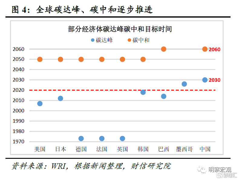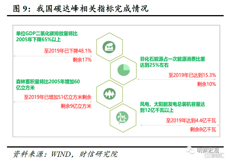 在2020年9月22日第75届联合国大会上,中国首次提出“二氧化碳排放力争于2030年前达到峰值,努力争取2060年前实现碳中和”,同年12月12日的气候雄心峰会上,进一步明确了“到2030年,中国单位国内生产总值二氧化碳排放将比2005年下降65%以上,非化石能源占一次能源消费比重将达到25%左右,森林蓄积量将比2005年增加60亿立方米,风电、太阳能发电总装机容量将达到12亿千瓦以上”四项具体目标。2021年3月15日中央财经委第九次会议,把碳达峰碳中和纳入生态文明建设整体布局,并具体安排“十四五”相关工作。