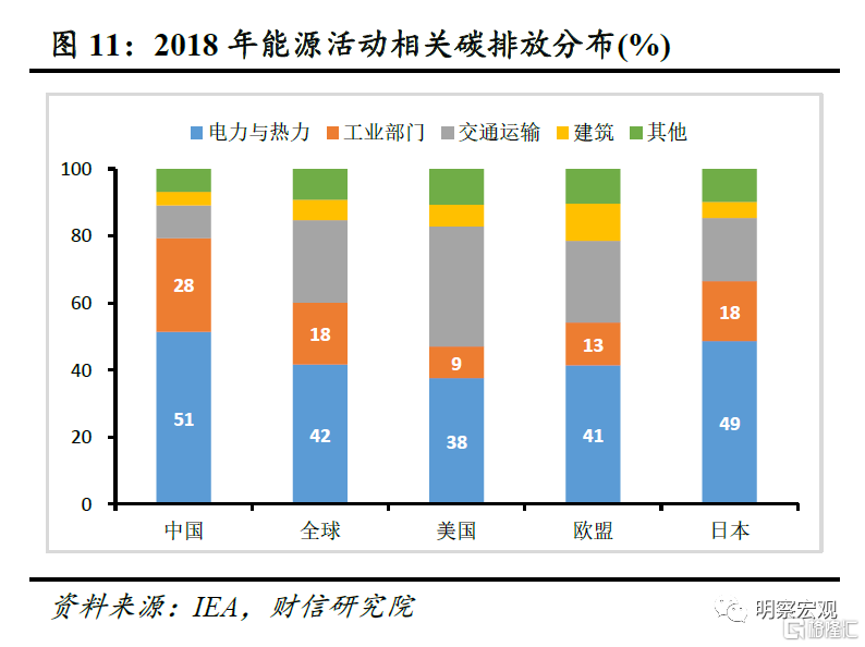 控制碳排放首先需摸清当前碳排放“家底”。我国碳排放主要来自能源活动,2017年能源活动碳排放量占比约为85%;工业生产过程中产生的温室气体,如水泥、玻璃生产过程中碳酸钙分解等占碳排放的10%;其余5%的碳排放来自动植物呼吸排泄和废弃物处理(见图10)。在能源活动中,部分高耗能行业碳排放量占比偏高,如电力热力占51%,工业部门(钢铁、建材、化工等)占28%,比重高于全球平均及美国、欧盟、日本等主要经济体的水平(见图11)。
