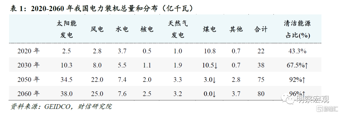 一是在能源生产端发展清洁能源,实现电力脱碳。煤电比重过高是我国电力热力部门碳排放量较高的重要原因,煤炭能源排放系数高,单位能量排放的二氧化碳比石油、天然气等其他化石能源高30%-80%。2018年中国煤炭发电占比超65%,远高于美日欧等发达经济体(见图13)。减少煤电占比,向清洁能源发电转型是能源生产部门碳减排的重要手段。根据全球能源互联网合作组织预测,2050年我国煤电占比将降至5.7%,清洁能源发电占比将达到90%以上(见图14),清洁能源将逐步取代煤电。假定2020-2030年、2030-2050年、2050-2060年我国用电量增速分别为3.6%、2%和0.6%,预计我国清洁能源电力装机量将由2020年9.5亿千瓦增至2060年的77亿千瓦;2060年煤电装机量由2020年的10.8亿千瓦降至0(见表1)。