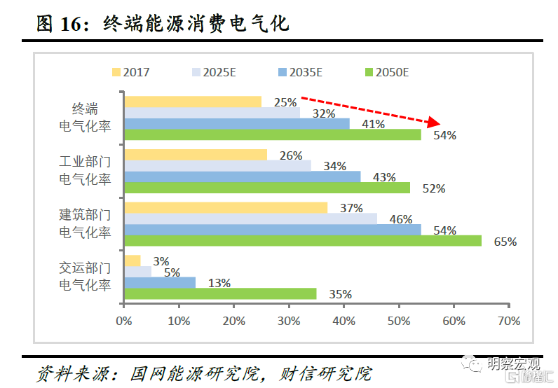 二是在能源消费端扩大清洁能源的使用,实现终端能源消费电气化。在电力脱碳的基础上,扩大电能在工业生产中的使用率有助于进一步减少碳排放。据国家电网测算,电气化率每提升1个百分点,有望减少终端能源消费约0.5亿吨标准煤,带动能源消费强度降低4%左右。2018年我国电力占终端能源消费比重仅25.3%(见图15),预计未来将大幅提高,到2050年将升至54%(见图16)。其中,交运部门电气化增长速度最快,2017-2050年电气化率将提高32个百分点,增幅为当前的10倍以上。
