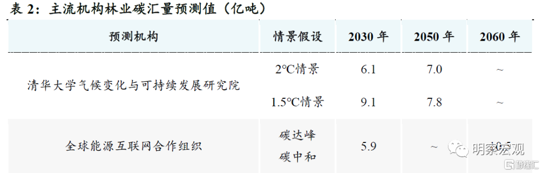 三是人为移除,即从大气中移除二氧化碳,包括碳捕获与封存、植树造林增加碳吸收。一方面,发展碳捕获与封存(CCS/BECCS)技术,将二氧化碳从碳排放源中分离出来,输送到封存地点,并长期与大气隔绝。据清华大学气候变化与可持续发展研究院预测,到2050年CCS/BECCS技术碳移除能力达到8.8亿吨/年。另一方面,增加林业碳汇,通过植树造林吸收大气中二氧化碳,预计2060年农林业碳汇将达到10亿吨以上(见表2)。