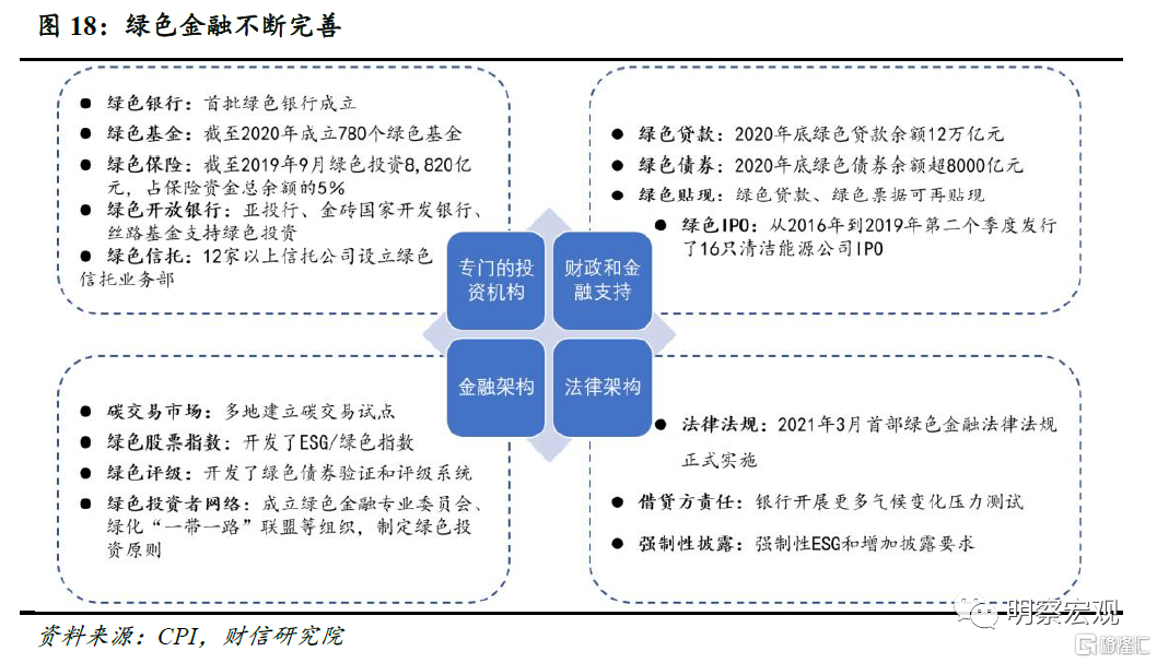 自“十三五”规划明确提出“建立绿色金融体系,发展绿色信贷、绿色债券,设立绿色发展基金”以来,国内绿色金融发展迅速。当前绿色投资机构遍地开花,绿色金融配套的金融架构和法律架构也在不断完善(见图18),但与实现碳达峰碳中和目标的金融需求相比仍有不小差距。