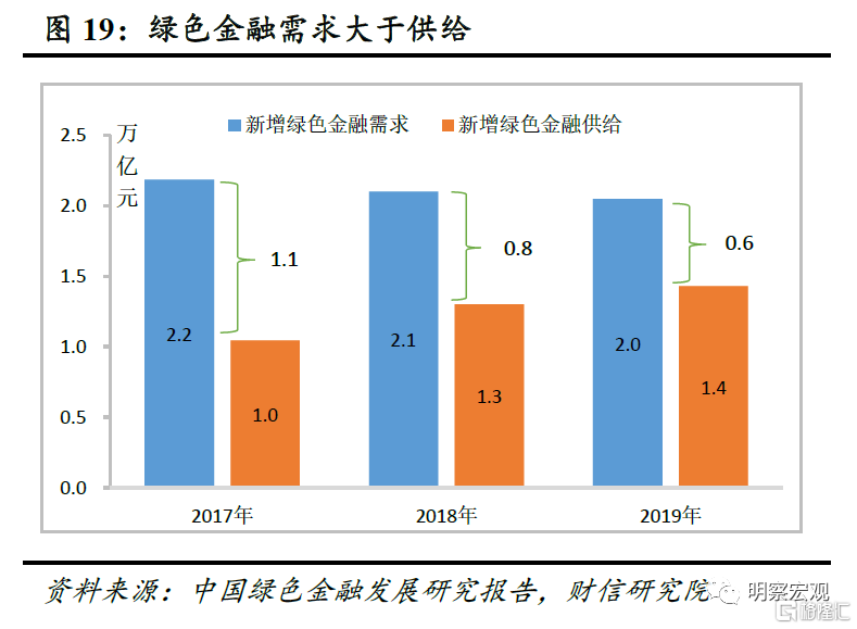 从总量上看,当前绿色金融供给不足以满足碳达峰碳中和的融资需求。如据清华大学气候变化与可持续发展研究院测算,2019年我国新增绿色金融供给1.4万亿,新增绿色金融需求2万亿,供需缺口0.6万亿(见图19)。未来碳达峰碳中和相关投资需求将进一步提升至每年3.5万亿元左右,绿色金融供给规模缺口扩大。