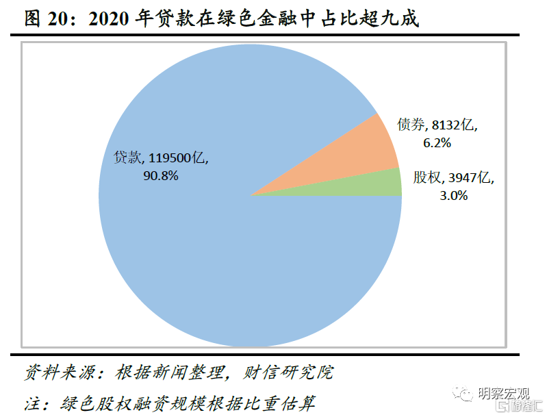 从结构上看,绿色金融工具种类单一。如2020年末绿色贷款占绿色金融存量的比重超过九成(见图20),主要原因在于当前我国绿色金融由政府和大型企业主导,大部分资金来自央企、政策性银行和四大国有商业银行,主要通过贷款等传统融资工具进行。债券、股权等直接融资参与绿色经济的意愿和动力不足,2020年末债市、股市规模达114万亿元、80万亿元,而绿色债券、绿色股权规模仅8132亿元、3947亿元,占比均不足1%。