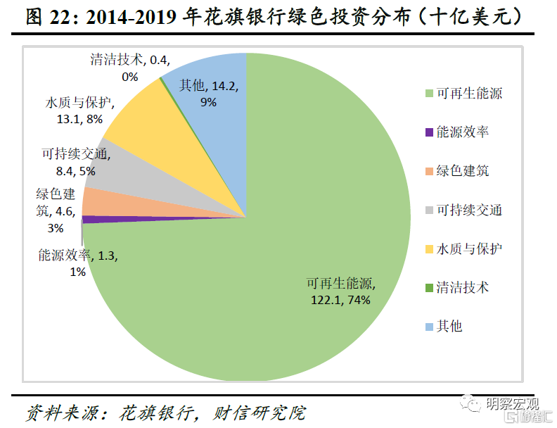 从投向分布上看,国内绿色金融供给与需求错配现象严重。从绿色金融供给看,2020年绿色贷款占绿色金融存量的九成,而绿色债券、绿色股权比重分别为6.2%和3.0%,加总不到10%,这是其一;其二是2019年末有43.7%的绿色信贷投向交通运输行业,仅24.4%投向能源供应领域(见图21)。从绿色资金需求看,绿色债券、绿色股权等资金融资机制更适合绿色发展对资金需求期限长、资金使用风险较高、资金需求多元化等特征,这是其一;其二是在未来国内绿色资金需求中,预计能源供应领域投资需求占比近八成,交通运输需求占比仅约一成(见图17)。从国际经验看,能源领域也是绿色金融主要投资方向,如2014-2019年花旗银行74%的绿色投资分布于可再生能源领域(见图22)。因此,国内各行业在绿色金融资金供求上不匹配现象明显。
