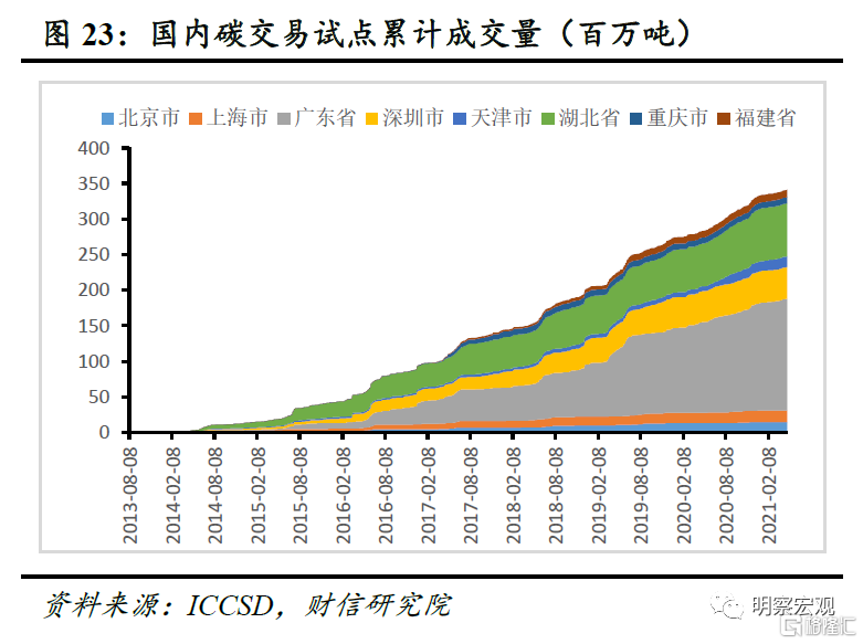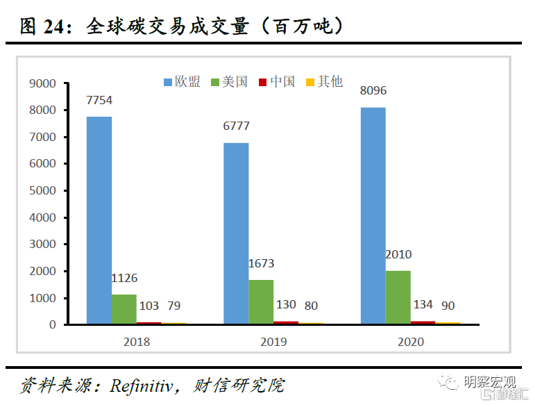 国内碳交易市场发展空间充足。中国是规模仅次于欧盟和美国的全球第三大碳交易市场,截至2020年末,国内八个碳交易试点累计成交3.4亿吨二氧化碳(见图23),覆盖钢铁、电力、水泥等20多个行业的近3000家企业。但国内碳交易市场仍处于试点阶段,相比欧盟、美国等成熟碳交易市场有不小差距,具有充足发展空间。一是成交规模较小。2020年中国碳交易试点共成交1.3亿吨,仅为欧盟的1.7%,美国的6.7%(见图24)。二是流动性不足。我国各个碳交易试点超过三成交易日无任何交易行为,2019年成交量仅为当年碳排放量的1.3%,同期美国碳交易市场成交量达到排放量的33.7%,欧盟碳交易市场流动性较好,成交量超过排放量的两倍。三是碳排放免费配额较多,整体市场供大于求,碳价格较低。2020年国内平均每吨二氧化碳价格为1.7美元,远低于美国7.3美元和欧盟18.3美元水平。