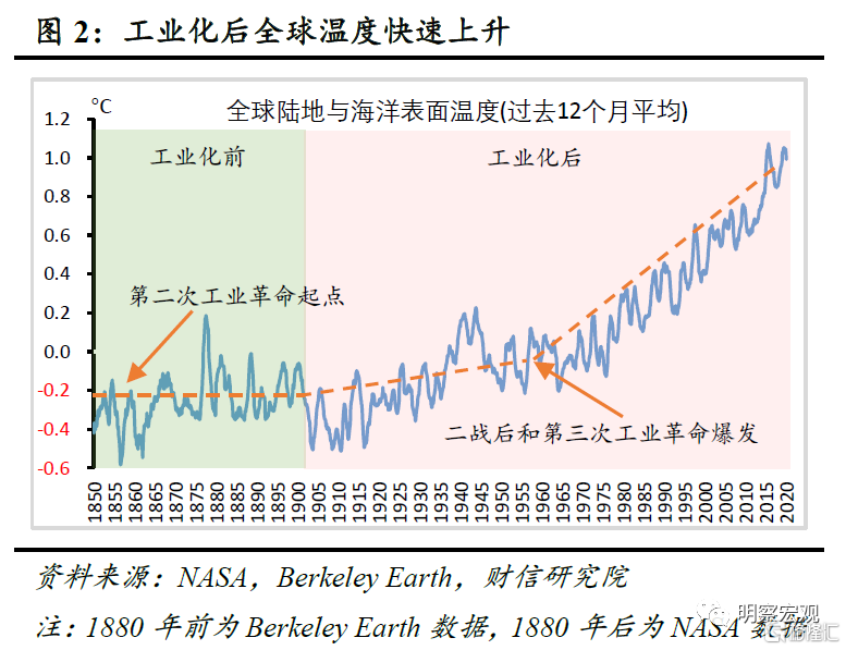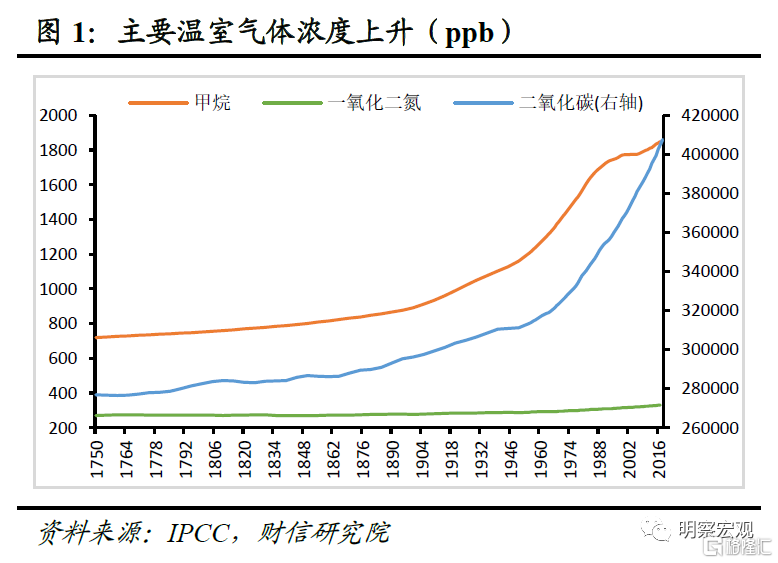 20世纪尤其是二战以来,温室气体过度排放引起的气候变化问题,日渐对全球生命系统构成威胁。根据政府间气候变化专门委员会(IPCC)数据,工业生产排放的大量温室气体已使大气成分发生显著变化,特别是1960年代以后,在第三次工业革命和战后稳定的全球政治经济形势推动下,工业化水平突飞猛进,温室气体排放量激增。截至2017年,大气中二氧化碳、甲烷、一氧化二氮等主要温室气体浓度较1900年增加了37%、108%、19%(见图1)。温室气体浓度的提高,使大气层吸收了更多的太阳辐射,造成全球变暖,如2021年1月全球陆地与海洋的表面温度,过去12个月的均值较1850-1900年的平均水平提高了1.3摄氏度(见图2)。由全球变暖引发的自然灾害(海平面上升、极端高温、物种灭绝等)及社会问题(粮食减产、气候疾病等)已成为人类文明可持续发展的潜在风险点。