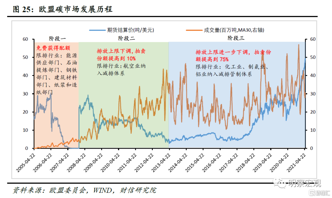 从国际实践看,碳交易市场发展并非一帆风顺,欧盟碳交易市场发展过程中经历了碳价走低、碳交易量下行、碳市场活跃度不高等问题(见图25),经验和教训明显:一是碳排放配额不宜过多。2013年以前欧盟碳市场存在配额过度分配问题,碳交易市场供大于求,碳价节节走低,如2008-2013年欧盟排放配额(EUA)期货成交价从29.3欧元降至2.7欧元。碳价信号疲弱,降低了投资低碳产业和技术积极性,对减排目标和绿色经济发展构成威胁。为此,试图降低排放上限和削减配额,但均面临极大的政治阻力,短期难以调整,特别是项目启动后降低排放上限难度较大,配额过度供给影响深远。二是拍卖份额逐步取代免费配额,循序渐进扩充限排行业。2013年以后,欧盟一方面下调排放上限,同时将拍卖份额逐步提高到75%;另一方面将化工业、制氨业、铝业等纳入减排管制体系。此后碳排放配额供给减少、需求增加,碳价信号渐强,对碳排放的约束力提升。