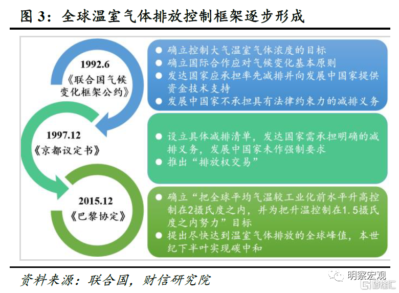 面对气候问题威胁,“碳达峰”、“碳中和”等全球范围内的温室气体减排承诺应运而生。由于温室气体排放引发的气候问题具有超越地域和时空的影响,全球各国走上共同治理、协议减排的道路。从1990年代起,全球温室气体排放控制框架和相关法令稳步推进(见图3),发达国家大多率先作出减排承诺并履行,发展中国家亦逐步跟进。当前减排目标主要围绕《巴黎协定》进行,根据协定要求,要把全球气温较工业化前水平(1850-1900年平均值)的升幅控制在2°C以内,并努力控制在1.5°C以内。为此需要使全球温室气体排放尽快达到峰值,并在本世纪下半叶实现温室气体排放与减排、吸收之间的平衡,即碳达峰、碳中和。目前美国、欧盟、日本等主要发达经济体已实现碳达峰,并制定了碳中和计划(见图4);而多数新兴经济体碳排放量仍在增加,印度、俄罗斯等主要二氧化碳排放增量国碳达峰年份尚未明确,全球碳达峰碳中和任重道远。