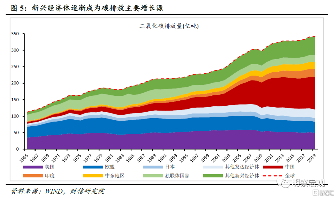 一是构建人类命运共同体。21世纪初期中国承接“世界工厂”角色,碳排放量快速提高,2000到2019年期间碳排放量增长192%,贡献了该时期全球62%的碳排放增量(见图5)。中国主动提出“30·60”目标,一方面是国内绿色发展理念在国际上的延伸,积极拥抱绿色低碳发展,主动承担全球环境治理责任,缓解全球治理赤字,是大国担当的体现;另一方面中国和西方在意识形态、人权等问题上很难达成共识,碳减排是少数几个可以取得共识的领域之一,提出“30·60”目标有助于提升我国国际影响力,一起构建人类命运共同体。