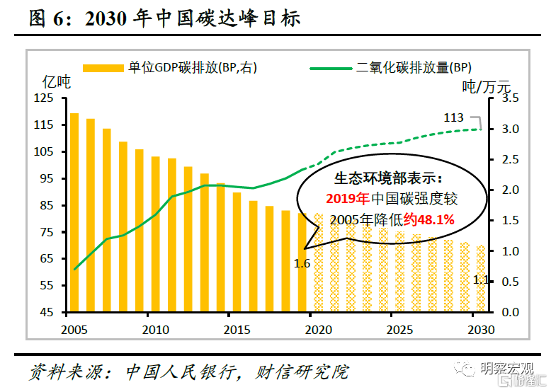 预计碳达峰时碳排放峰值在113亿吨左右。根据2020气候雄心峰会上中国提出“到2030年,中国单位国内生产总值二氧化碳排放将比2005年下降65%以上”的承诺,以及2005年我国每万元GDP排放二氧化碳(碳排放强度)为3.3吨,可推算出2030年每万元GDP排放二氧化碳将在1.1吨以下。此外,根据“到2035年实现经济总量或人均收入翻一番”的远景目标,预计2030年GDP在103万亿(2005年不变价)左右。综合2030年GDP和碳排放强度预测值,能估算出2030年碳达峰时碳排放峰值约为(见图6)。